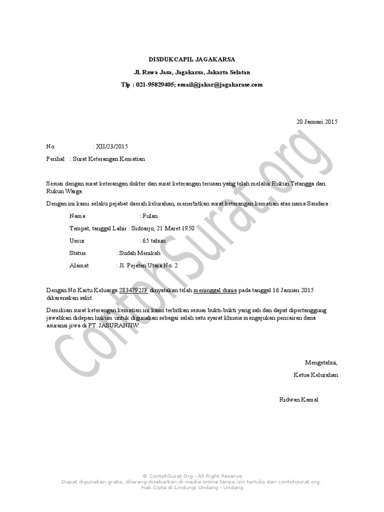 Penting untuk meminta izin kepada pihak rt, rw, kades, camat hingga polres atau polsek sebelum memulai acara jika tidak ingin acara. Surat kematian dibuat untuk berbagai keperluan terkait, misalnya untuk membuat pengalihan harta warisan, asuransi, menghapus keluarga yang meninggal dari kartu keluarga dan kepentingan lainnya. Contoh surat kuasa pengurusan akta cerai untuk contoh surat kuasa dan contoh format administrasi surat menyurat lainnya. Winata bin enan salwi tempat, tanggal lahir / umur : Contoh surat keterangan kematian dari rt seperti harus memiliki surat pengantar penerbitan dari ketua rt rw dan kelurahan.